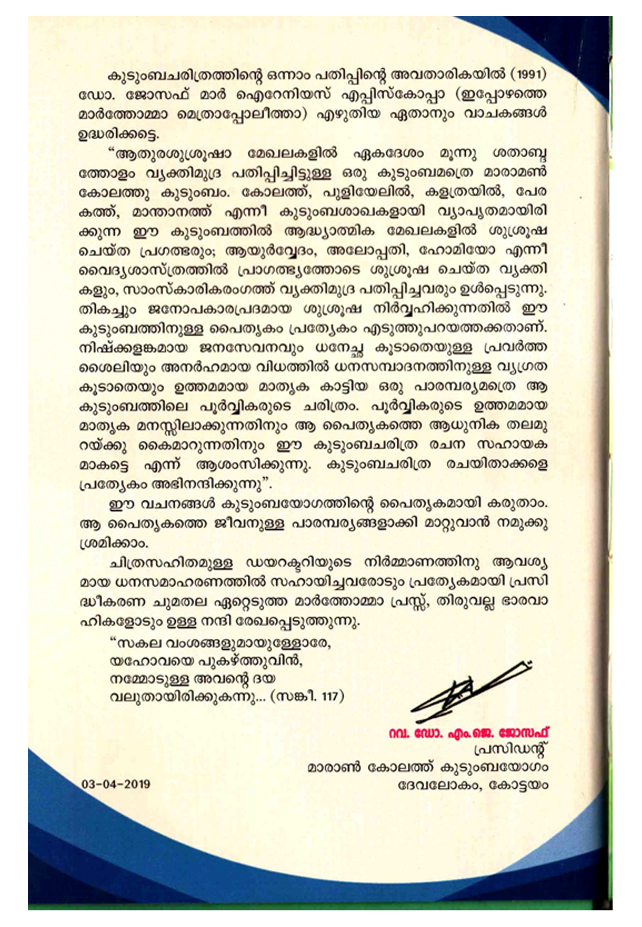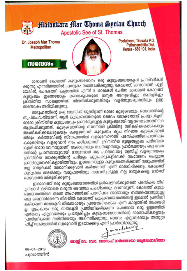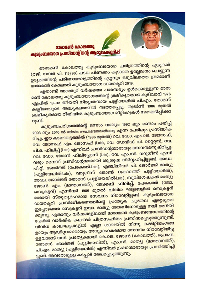 By the grace of God,Maramon Kolathu Kudumbayogam Family Directory was published in May 2019.
